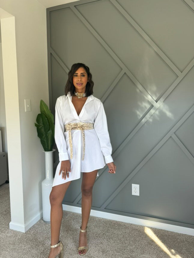 Note: Payal is seen wearing our white OBI on a White Asymmetrical Shirt Dress