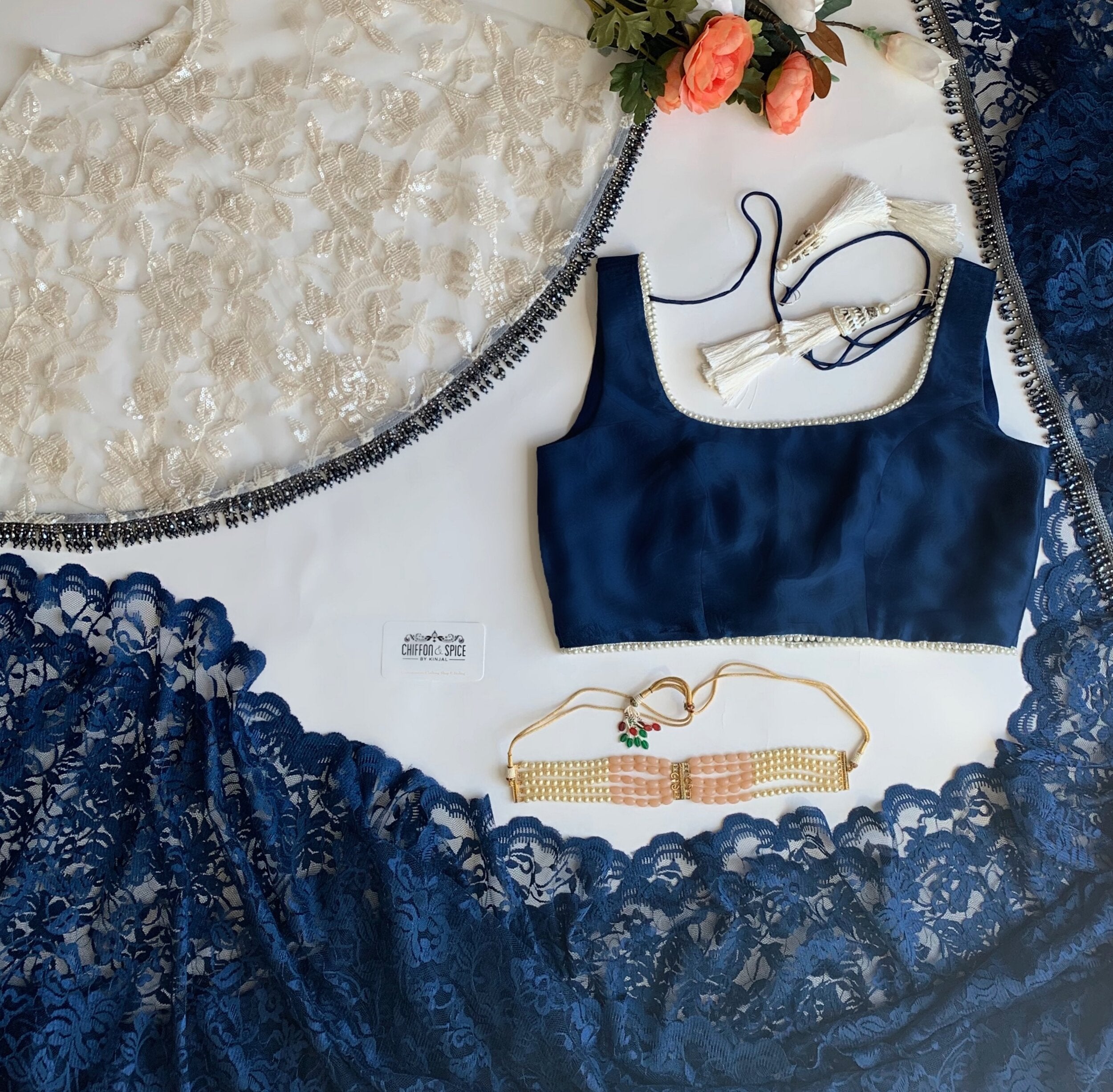 A classic blue Chantilly lace sari with a vertical bead panel paired with a matching buttery soft silk blouse lined with faux bead work and adorned with white tassels.