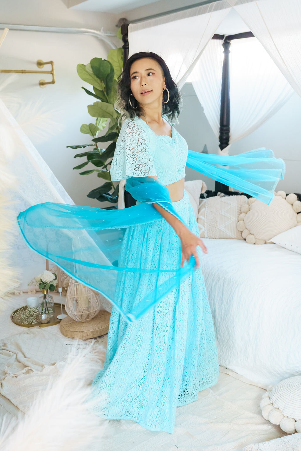 Cinderella Vibes at their best in this three piece crochet lehenga set in monochrome vibrant blues.