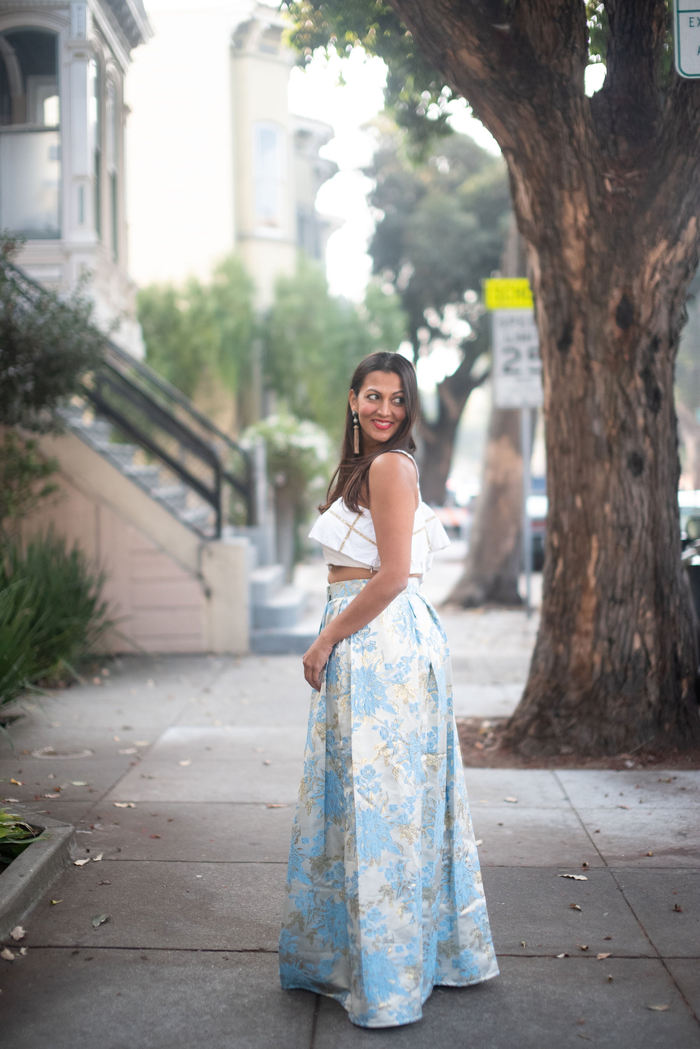 A swoon worthy ice blue, gold and ivory jacquard wrap skirt paired with an ivory and gold accent criss cross ruffle blouse. One of the most unique pieces in our Capsule Collection ‘Explore’