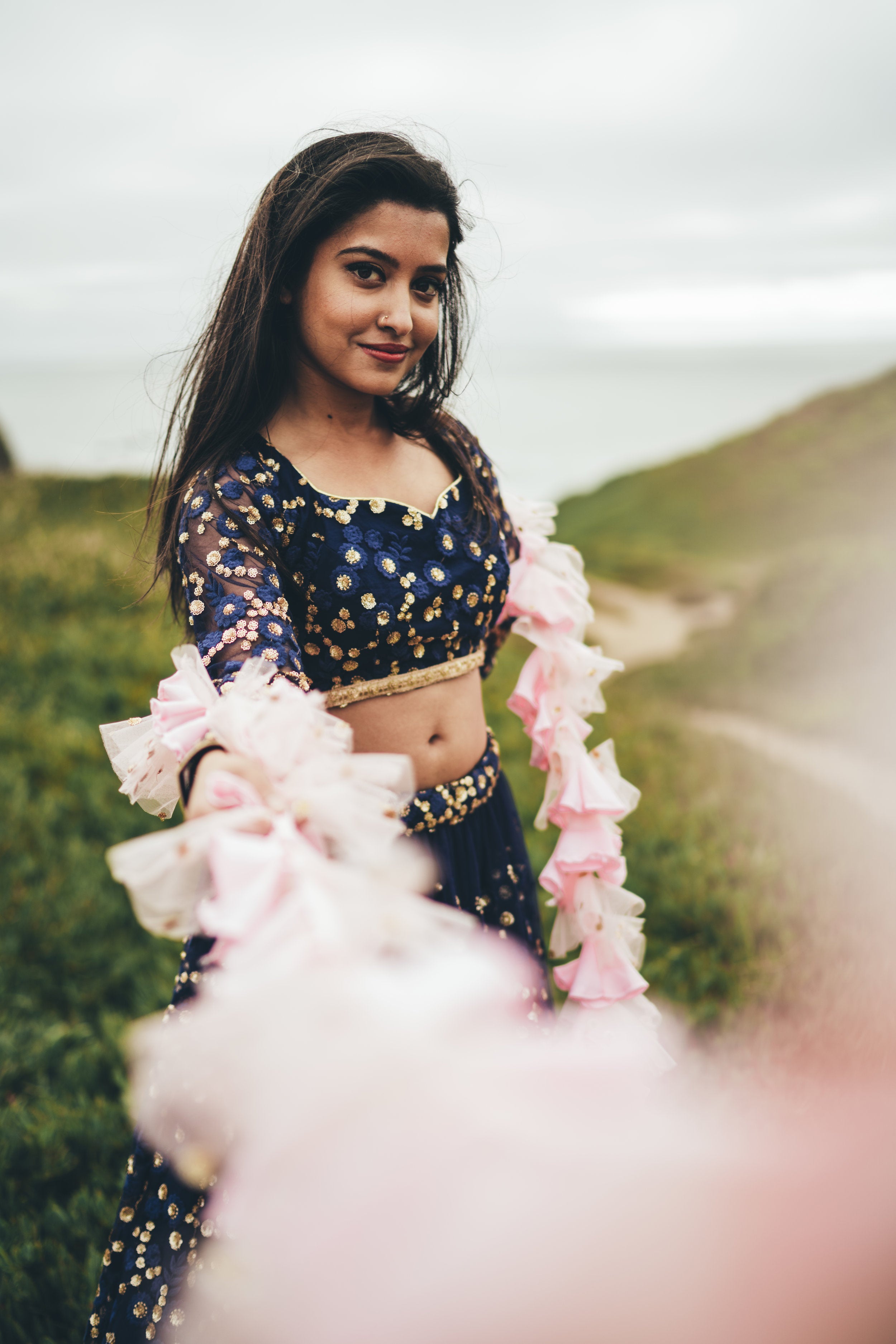 A luxurious navy blue net lehenga drenched with fine floral thread work all around every square inch and drizzled with gold sequins. The unique and ultra fun baby pink boa tassel dupatta completes the look.