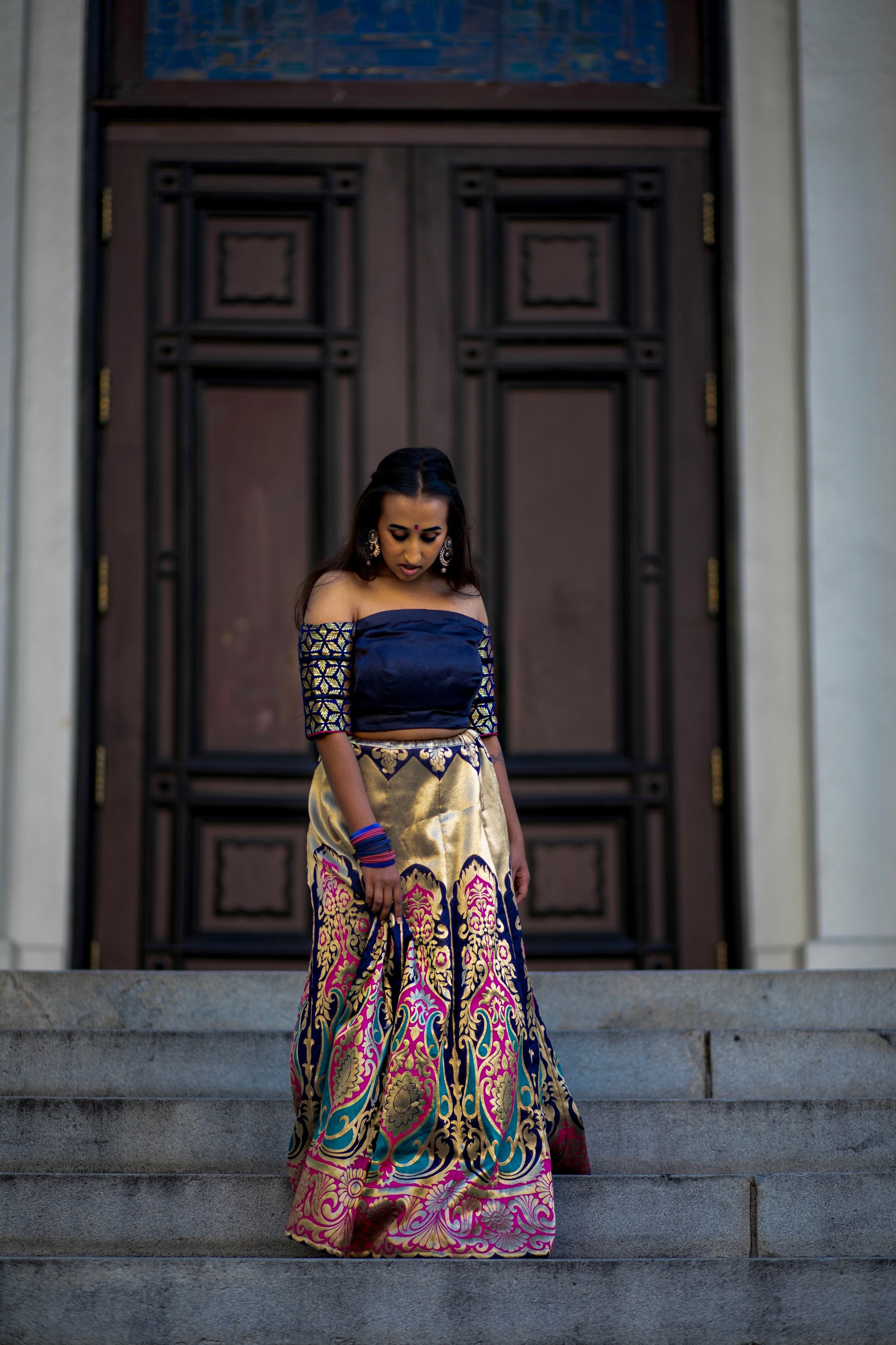 A three piece ensemble with a metallic gold based skirt with a bold damask like pattern in a magenta, navy and teal, a navy blue off shoulder blouse with bicep length sleeves and a complementing magenta dupatta.