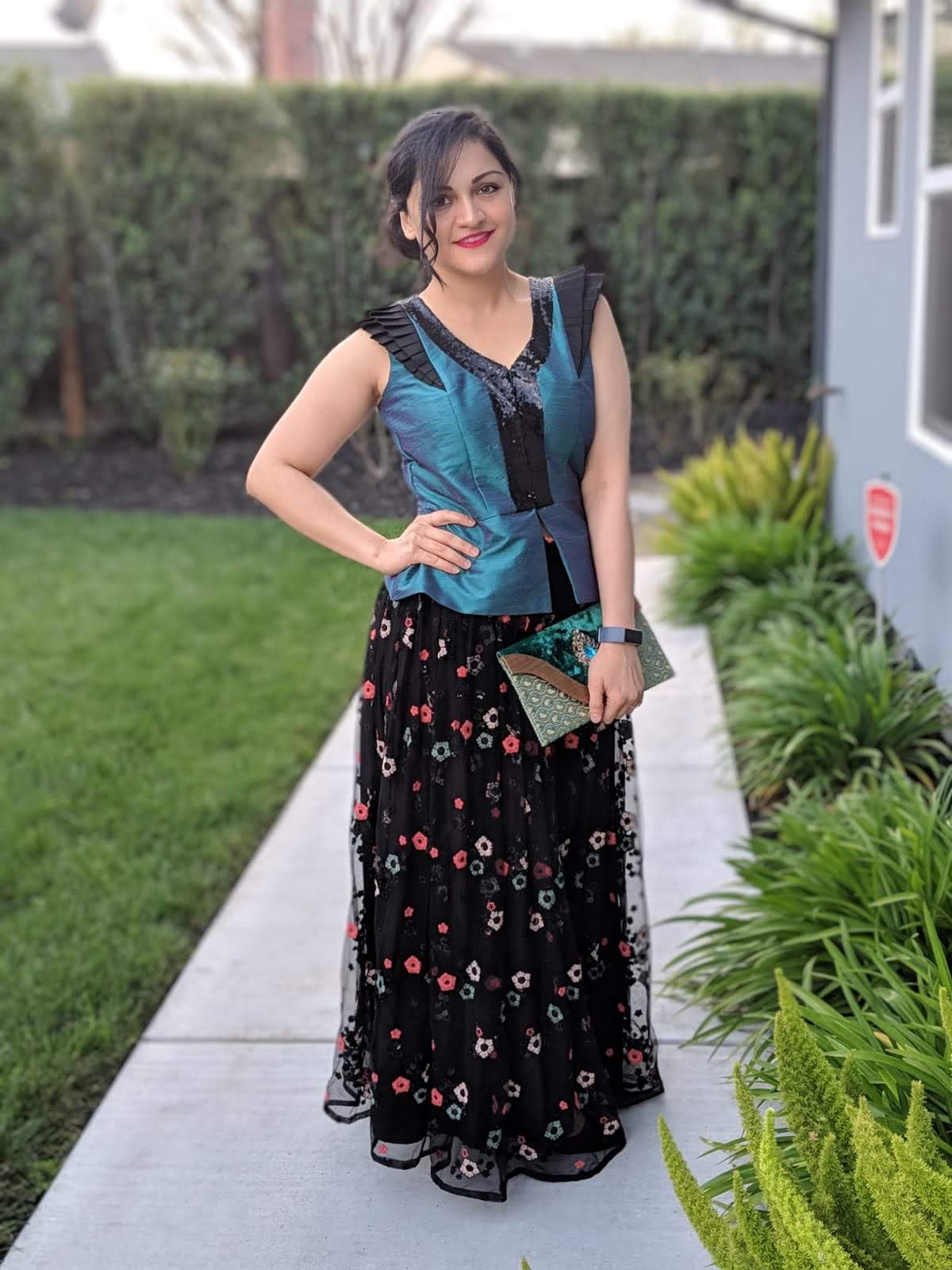 A pair of black net multi colored embroidered daisy Palzaao pants paired with a contrast teal peplum center slitted top that has micro pleated shoulders and a sequin neck and mid bodice