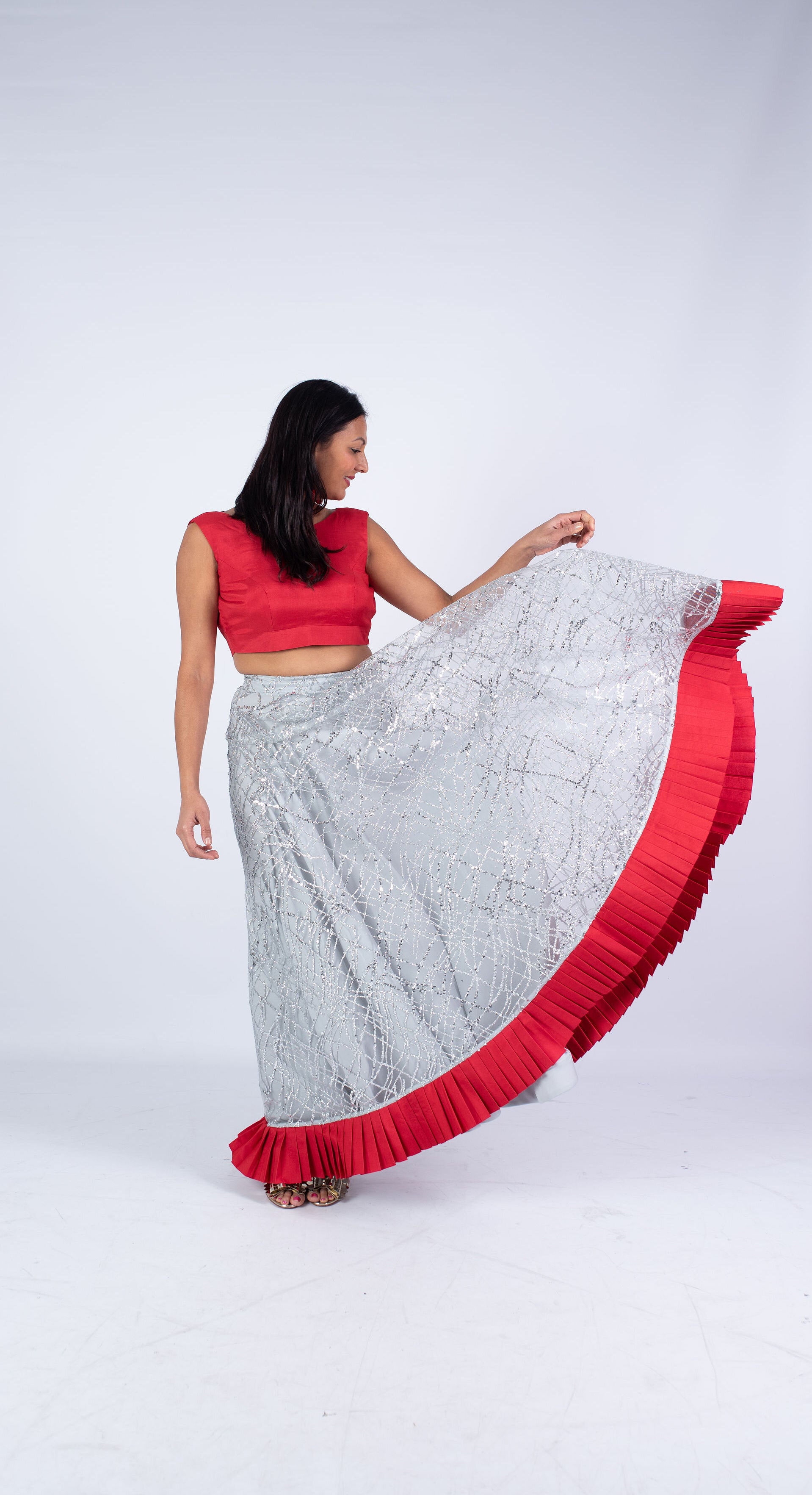 A lehenga ensemble featuring a grey net skirt with silver glitter sparkle and scarlet pleated border matched with a santoon silk blouse with the most alluring bow back.