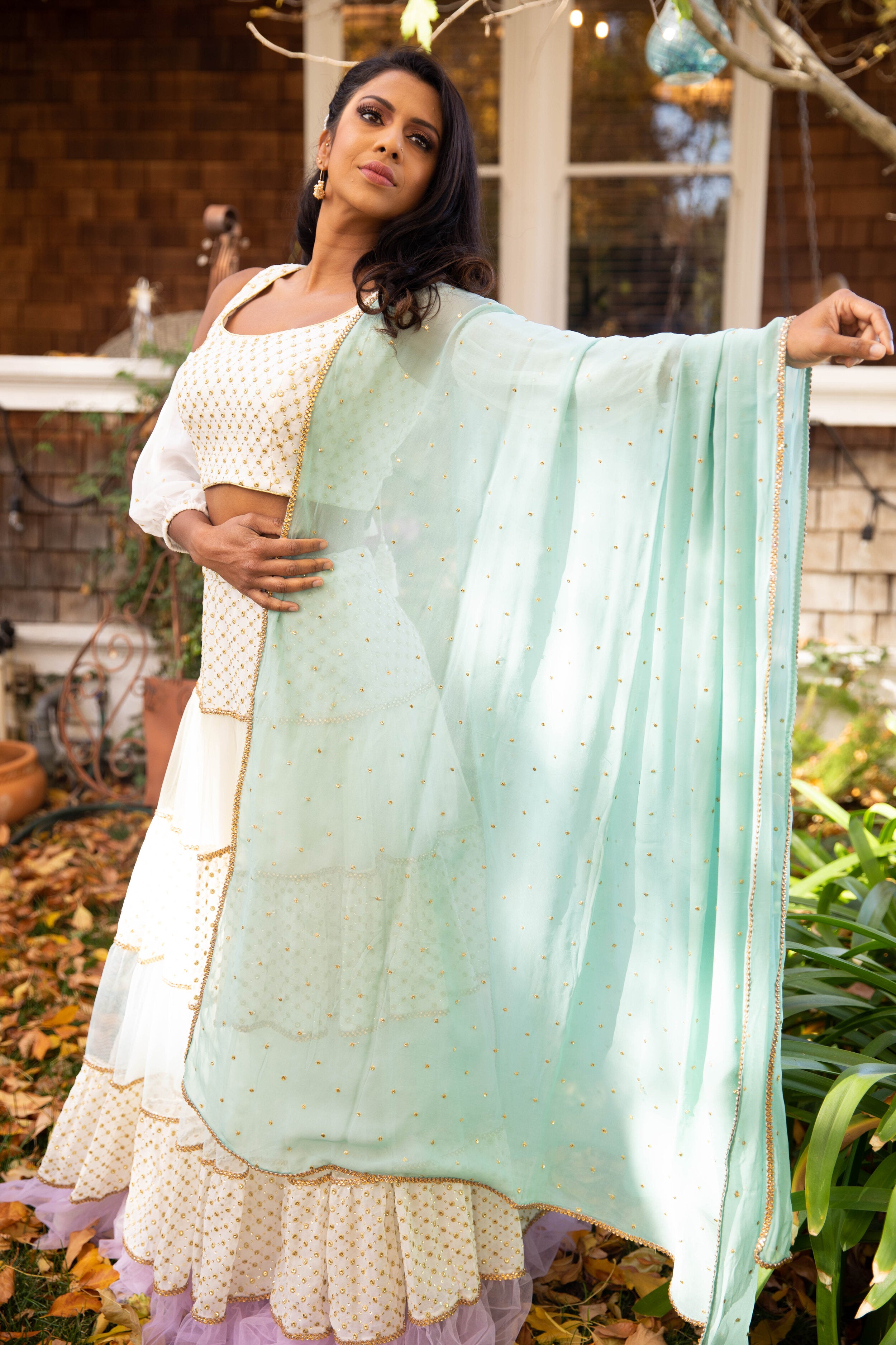 This angelic three piece lehenga set has a sleeveless blouse with dull gold sequin dots encased in threadwork and detachable sleeve cuffs. It is paired with a skirt with pastel net panels in a pale yellow, baby blue and lilac.