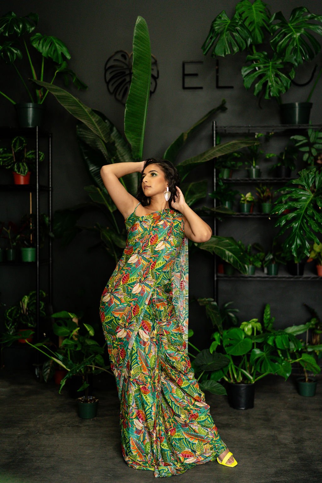 A ready to wear sari straight out of the tropics with bold leaf pattern on organza silk. The piece has pre pleating on the body, a three hook closure panel on the front fixed belt and elastic back for added flexibility. A criss cross corset criss cross backed blouse with hanging tassels completed the look.