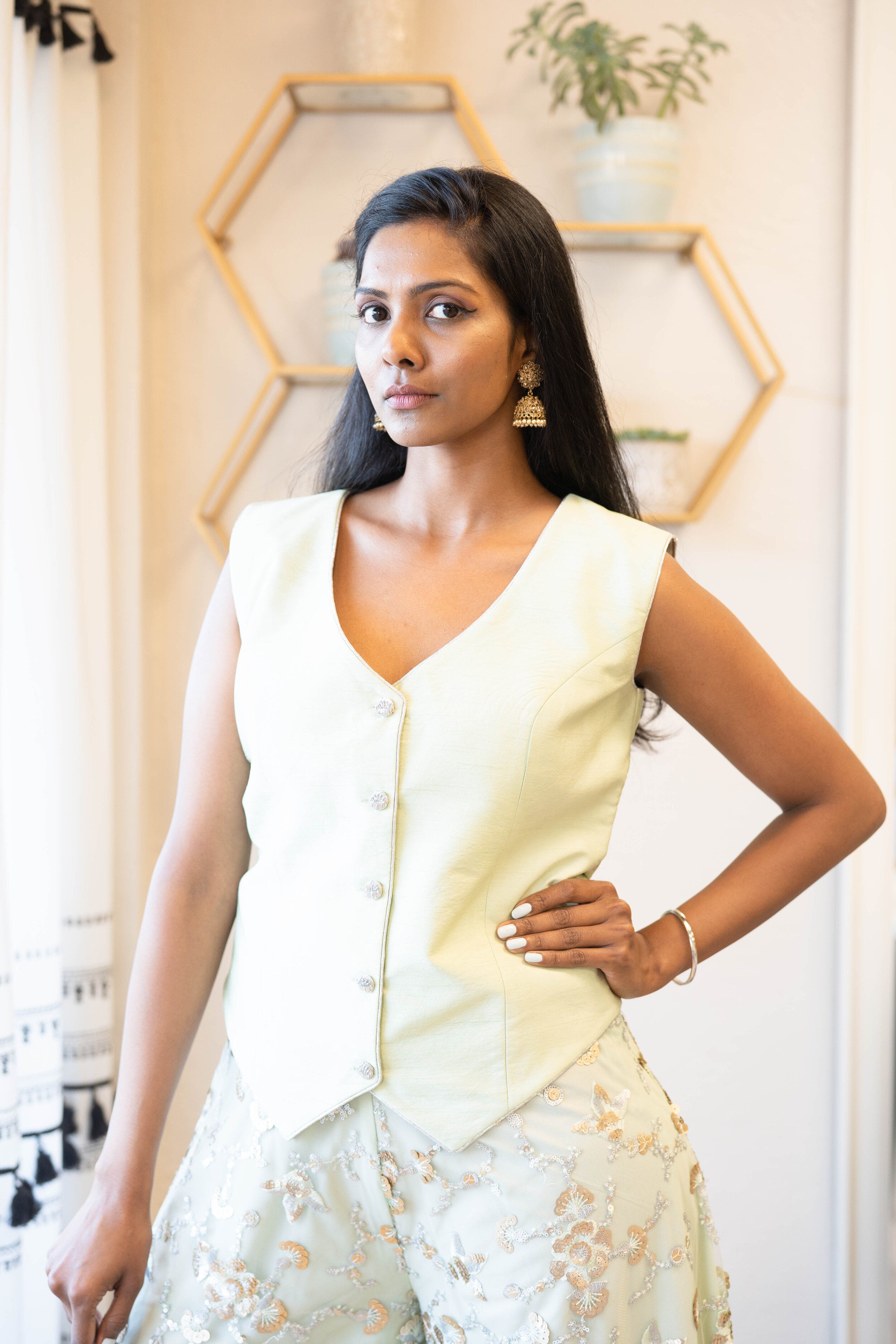 A mint green uniform style vest with silver piping and button detailing paired with a palazzo pant covered in matching mint and silver detailing.