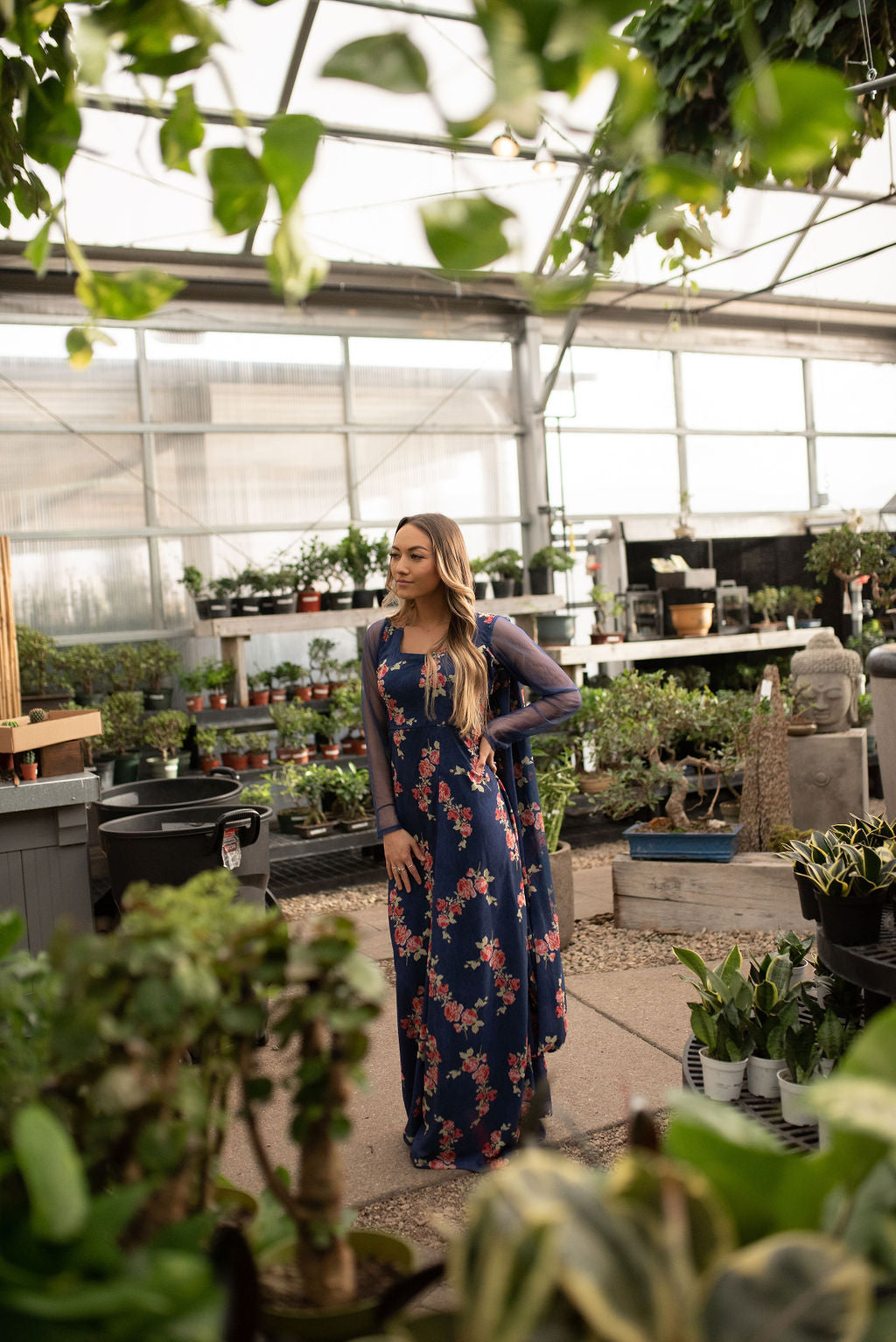 A sari maxi dress in a blue floral georgette with full sheer net sleeves.