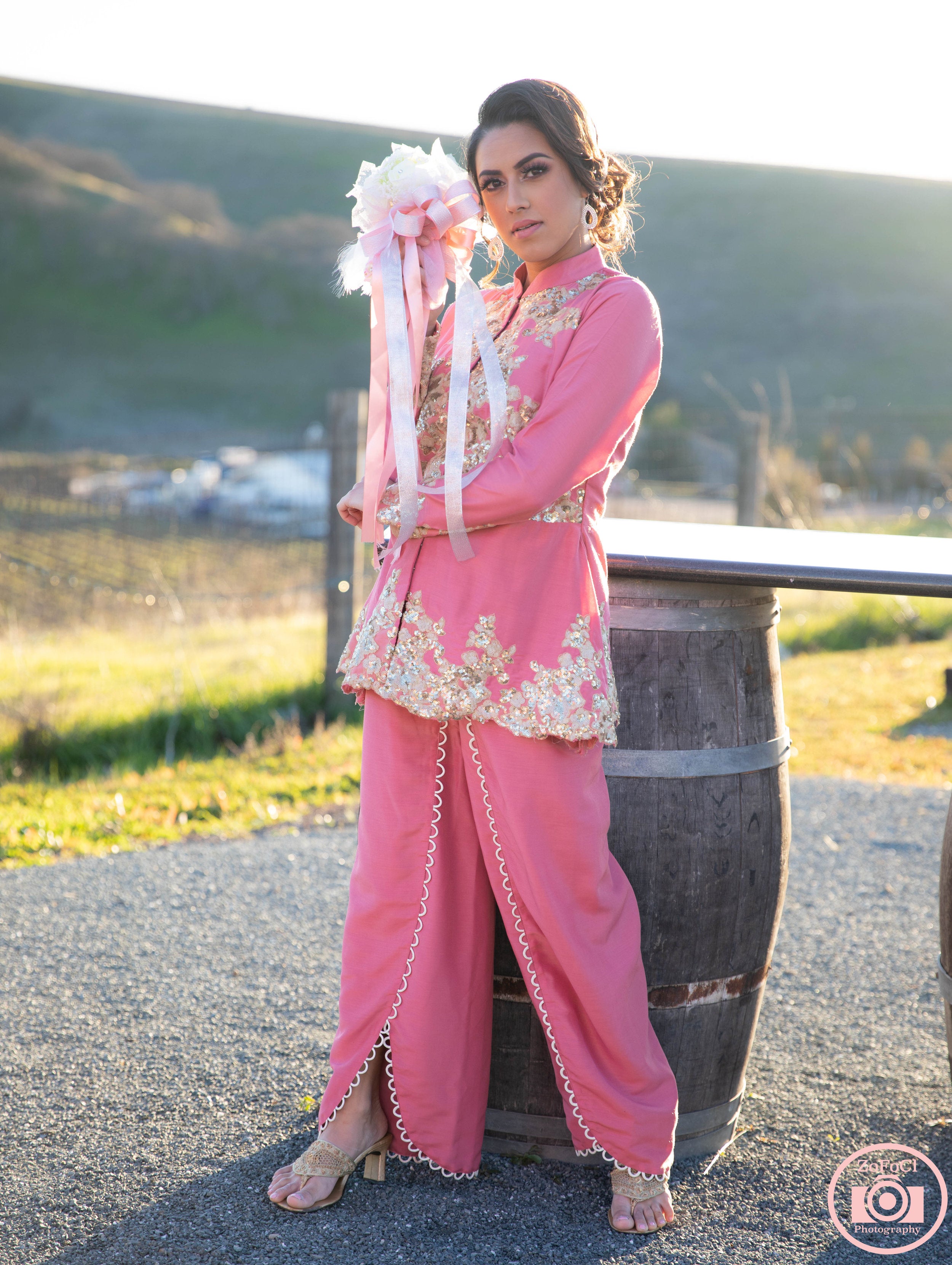 A pretty in pink long peplum silk top paired with wide leg tulip cut pants with white fabric scalloped edges.