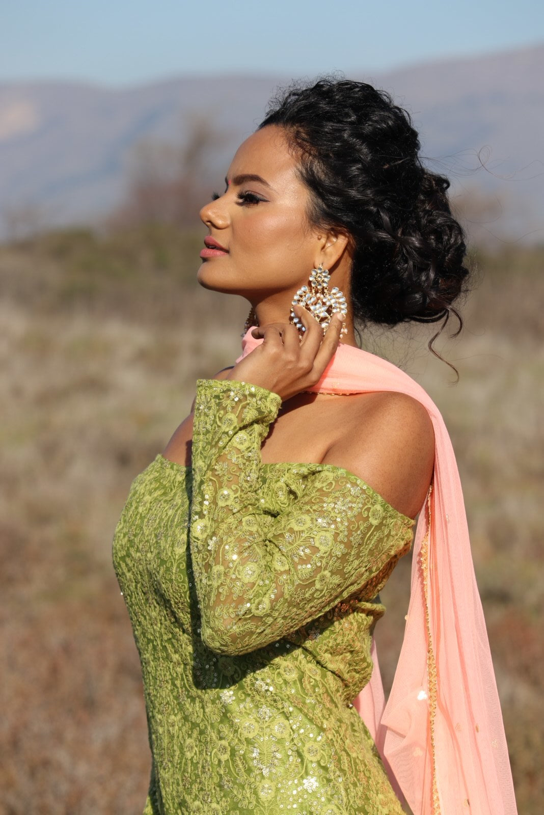 An olive off shoulder scalloped top with a contract peach-pink net dupatta (sash) paired with a simple gold Lycra legging.