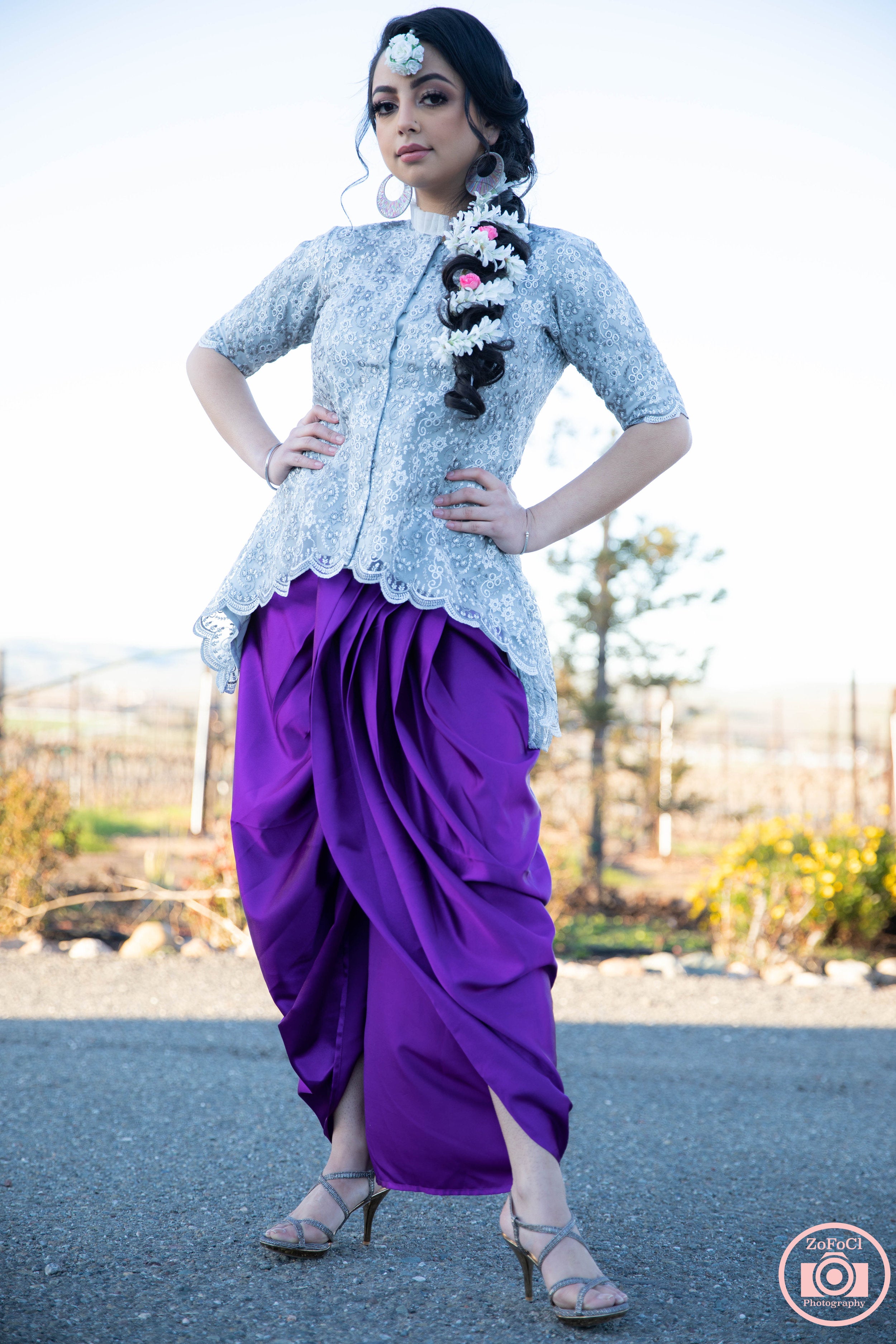 An amethyst colored satin pleated wrap dhoti skirt with a grey and silver thread work peplum top with scalloped border and 3/4 length sleeves.