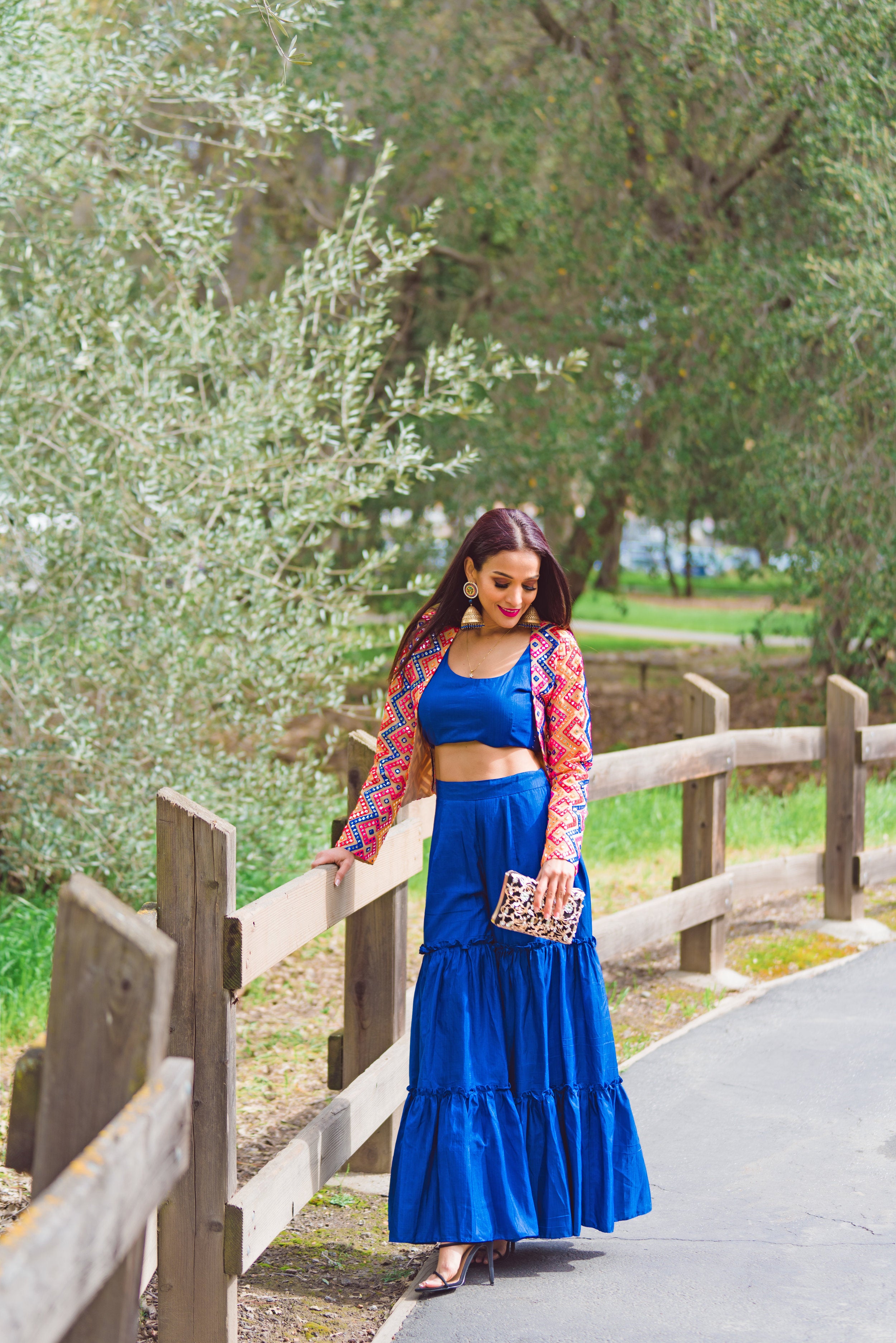 A royal blue sharara set with a faux mirror and multicolored thread work jacket