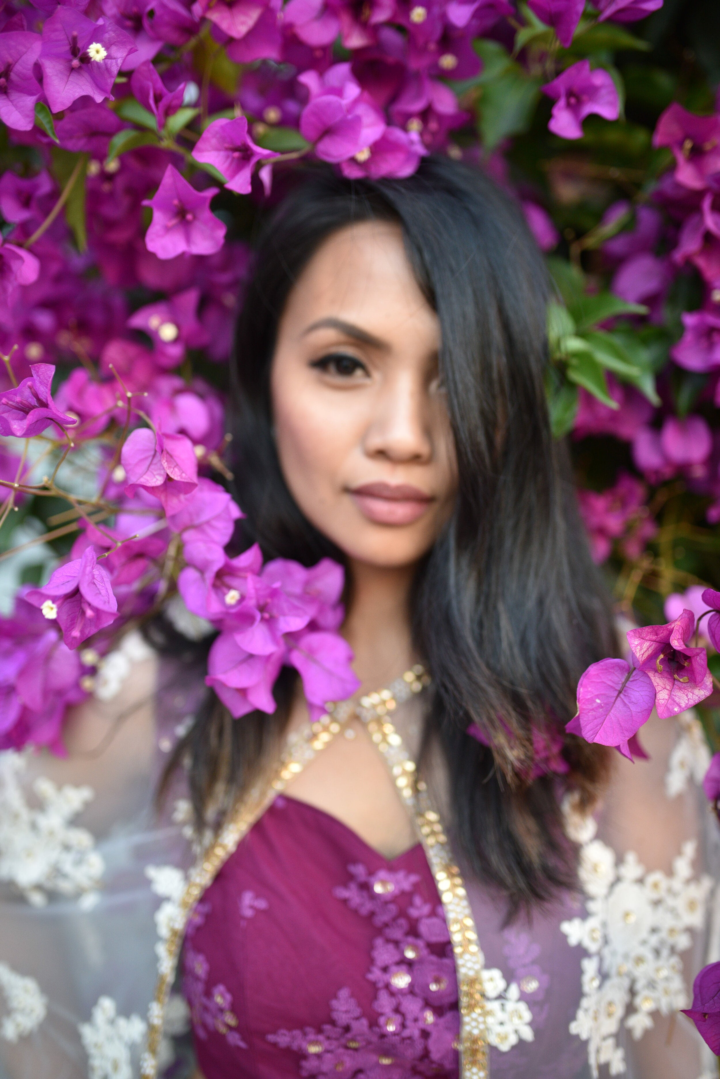 An ethereal white net embroidered cape with gold bead and faux pearl outlining, a single hook closure at the collarbone, a plum colored embroidered blouse and matching trousers which have a tapered fitting at the calf.