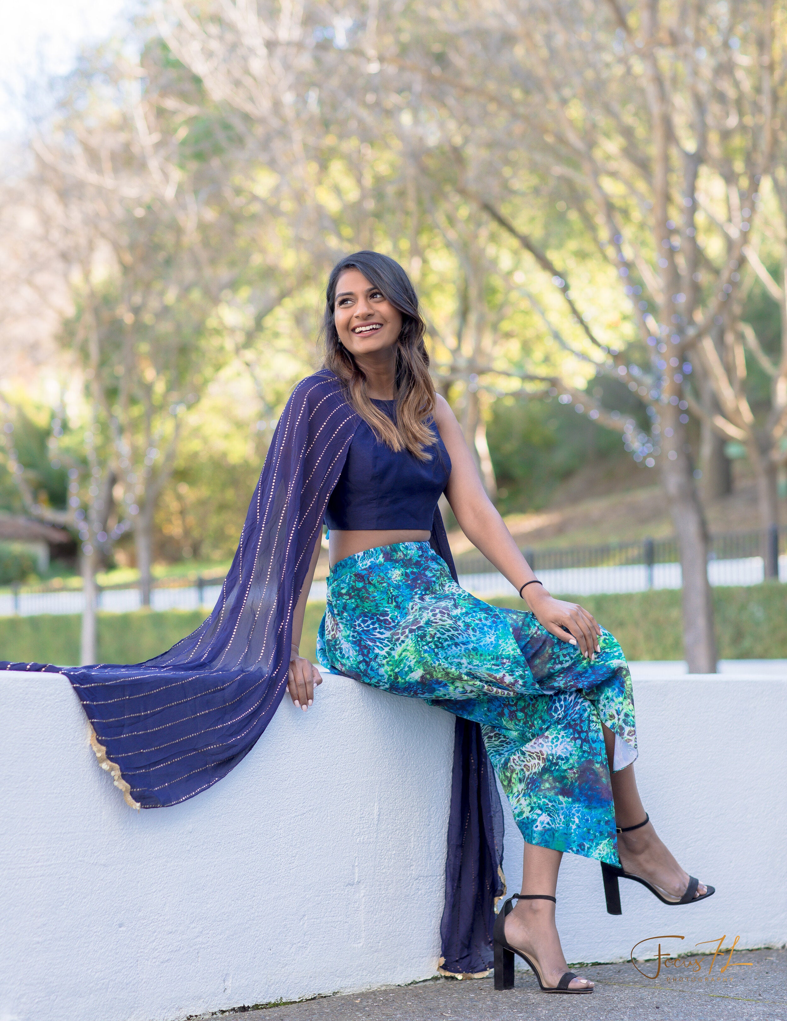 This wild two piece set includes a marbled animal print slimming dhoti with side panels & a navy blue top with double cape shoulder sleeves and gold appliqué work scatted throughout.