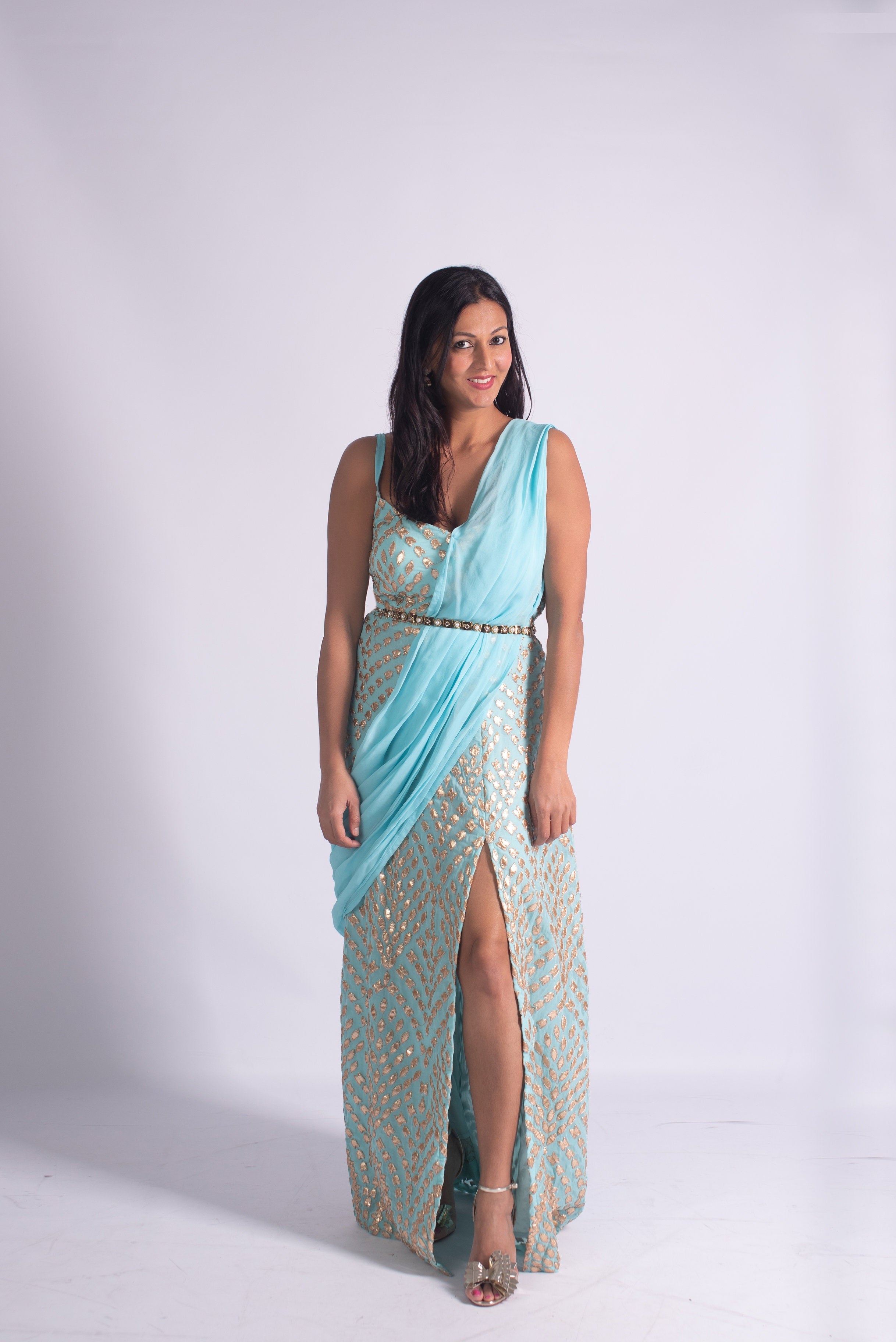 A baby blue sari maxi dress, pre pleated and adorned with gota work, solid georgette pallo and an edgy slit.