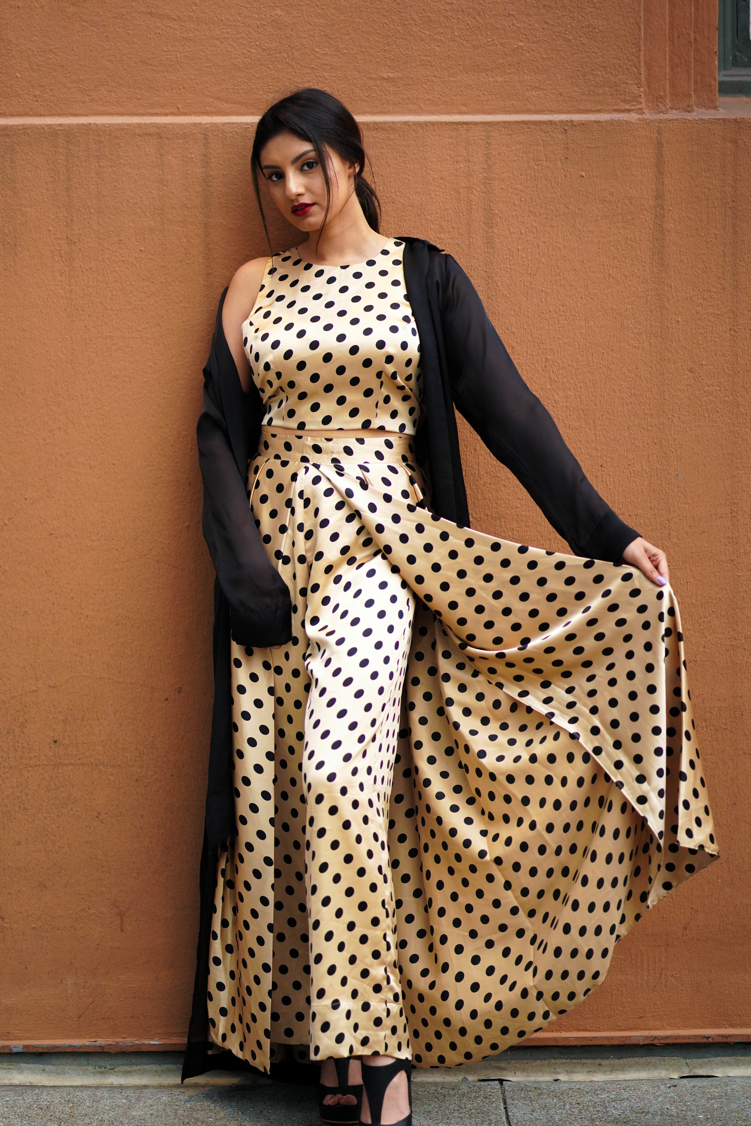 This satin set includes a skant (skirt pant) and longer crop with a sheer georgette black vest duster.